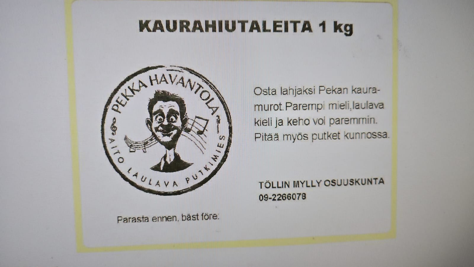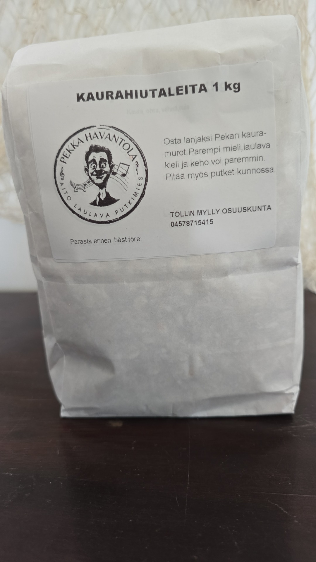 Kaurahiutale Töllin mylly 5e/kg saatavuus 1kg ja 2kg pusseissa.